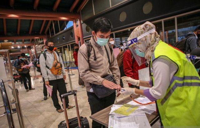 Ilustrasi: Petugas memeriksa kesehatan calon penumpang sebelum pemberangkatan di Terminal 2 Bandara Soekarno Hatta, Tangerang, Banten, Jumat (15/5/2020). (ANTARA FOTO)