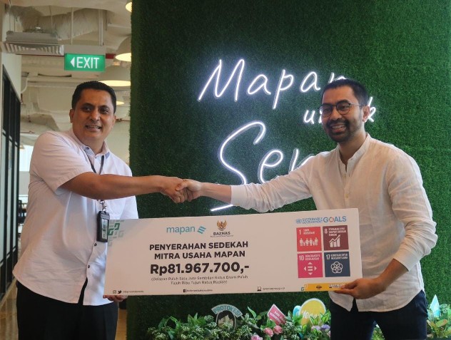 Secara simbolis penyerahan sedekah dari mitra usaha MAPAN diselenggarakan di Kantor Mapan, Selasa (18/4/2023). Turut Hadir Pimpinan BAZNAS RI Bidang Pengumpulan Rizaludin Kurniawan S.Ag., M.Si, serta Direktur Keuangan MAPAN Vinsen Adhitya.