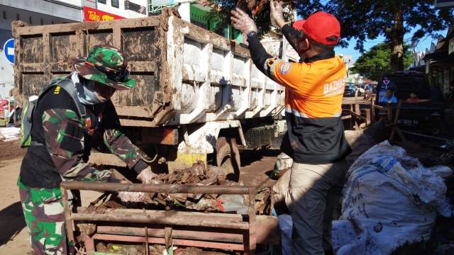 Tim BAZNAS bergabung bersama personel TNI/Polri dan BNPB membantu membersihkan lumpur, genangan air serta berbagai macam puing-puing bangunan yang berserakan di Pasar Sentral agar dapat segera digunakan untuk aktivitas jual beli kembali.