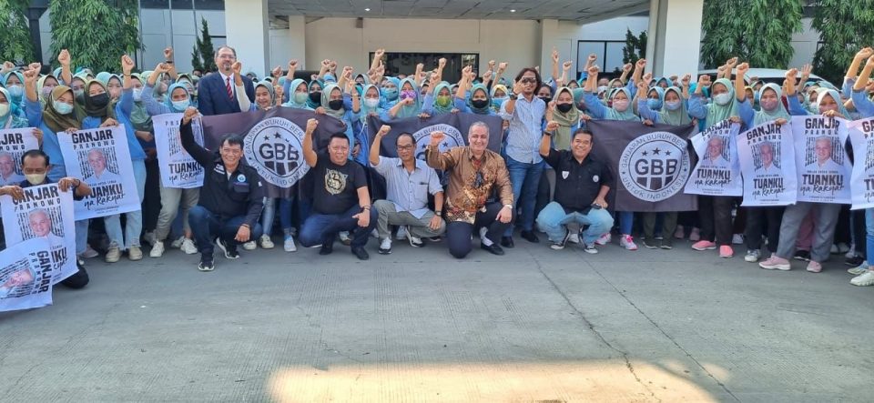Tampak dalam acara foto bersama di depan loby perusahaan ratusan buruh yang mayoritas perempuan itu berbaris dan memegang bendera GBB dan banner Ganjar Pranowo: Tuanku Ya Rakyat! Dengan penuh semangat mereka kompak meneriakkan yel-yel Ganjar Pranowo, Presiden! dan Kami Siap Memenangkan Pak Ganjar Jadi Presiden! (Wis)