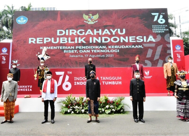 JAKARTA (Suara Karya): Mengenakan pakaian adat Bali, Menteri Pendidikan, Kebudayaan, Riset, dan Teknologi (Mendikbudristek), Nadiem Anwar Makarim mengikuti Upacara Peringatan Detik-Detik Proklamasi Kemerdekaan ke-76 Republik Indonesia dari halaman Kantor Kemdikbudristek di Senayan, Selasa (17/8/21).