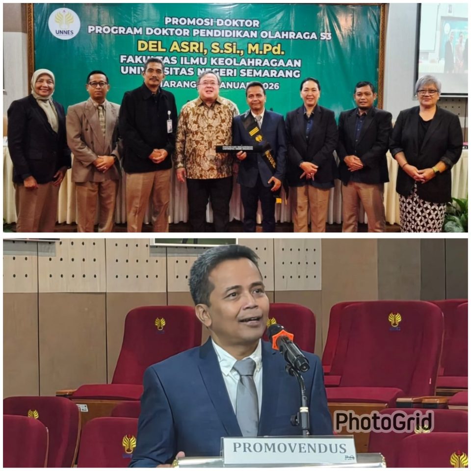 Pada ujian sidang yang berlangsung Senin, 26 Januari 2026 di Aula Lantai 3 Gedung Dekanat FIK UNNES, Del Asri berhasil mempertahankan disertasi “Evaluasi Implementasi Desain Besar Olahraga Nasional Tahap I Periode Tahun 2021-2024” dihadapan tim penguji antara lain: Dr. Taufiq Hidayah, M.Kes (Dekan FIK UNNES-Pimpinan Sidang). Dr. Andry Akhiruyanto, S.Pd., M.Pd, Prof. Bambang P.S. Brodjonegoro, Ph.D. (Guru Besar Fakultas Ekonomi Universitas Indonesia), Dr. Said Junaidi, M.Kes., Prof. Dr. Tandiyo Rahayu, M.Pd (Promotor), Prof. Dr. Heny Setyawati, M.Si. (Kopromotor) dan Prof. Dr. H. Hari Setijono, M.Pd. (anggota promotor).