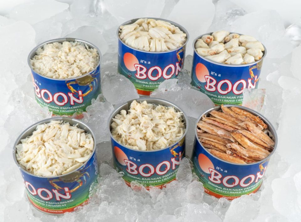 Kelezatan rajungan produksi Aruna untuk pasar ekspor, kini masuk pasar domestik dengan merek Boon. Produk yang dikemas secara higienis itu siap diolah menjadi masakan yang lezat. (Tri Wahyuni)