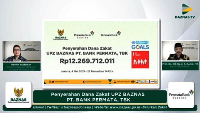 Penunaian Zakat UPZ Permata Bank Syariah kepada BAZNAS RI diserahkan oleh Direktur Permata Bank Syariah, Herwin Bustaman disaksikan Ketua Dewan Pengawas Syariah Bank Permata Syariah, H Muhammad Faiz, MA kepada Ketua BAZNAS RI, Prof Dr KH Noor Achmad, MA secara virtual, Selasa (04/05/2021) siang.