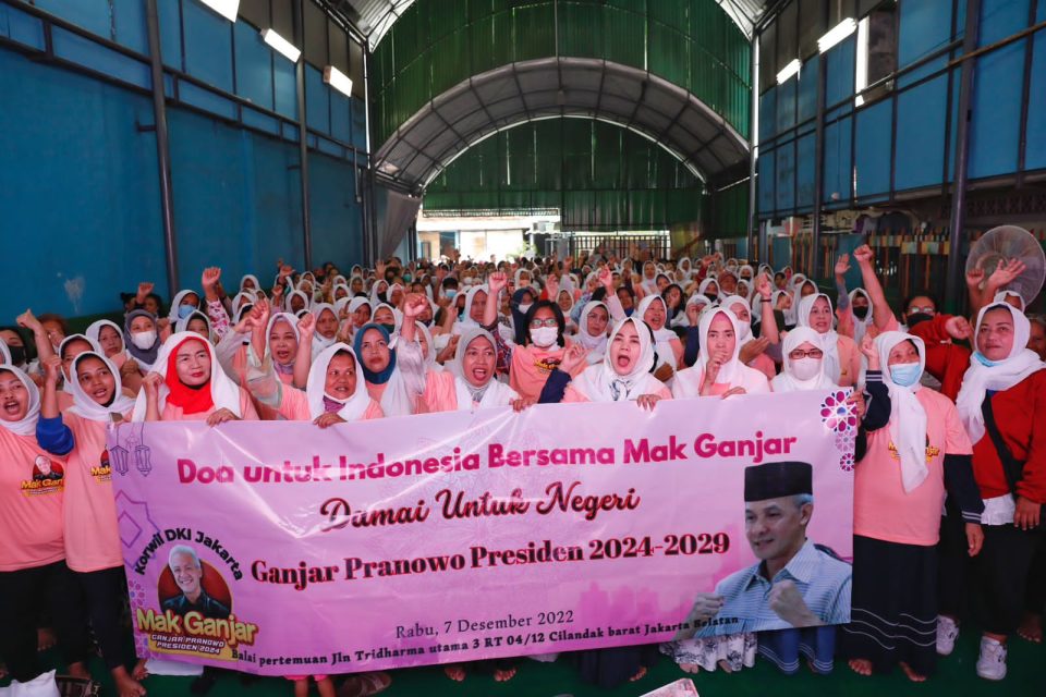JAKARTA (Suara Karya): Sebanyak 1.500 emak-emak pendukung Ganjar Pranowo yang berjejaring dalam Mak Ganjar DKI Jakarta menggelorakan apresiasi ‘Ganjar Presiden 2024’ di Balai Warga Kecamatan Cilandak, Jakarta Selatan, Rabu (7/12/2022).