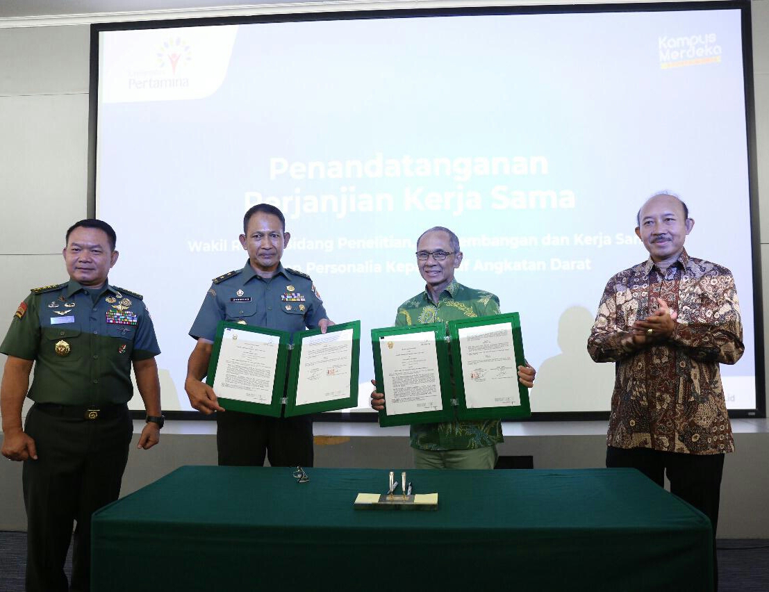Penandatanganan kerja sama tersebut dilakukan Asisten Personel (Aspers) KSAD, Mayjen TNI Darmono Susastro, dengan Wakil Rektor Bidang Penelitian, Pengembangan, dan Kerja sama Universitas Pertamina, Prof Dr Wawan Gunawan A Kadir, di Jakarta, Sabtu (4/6/22).