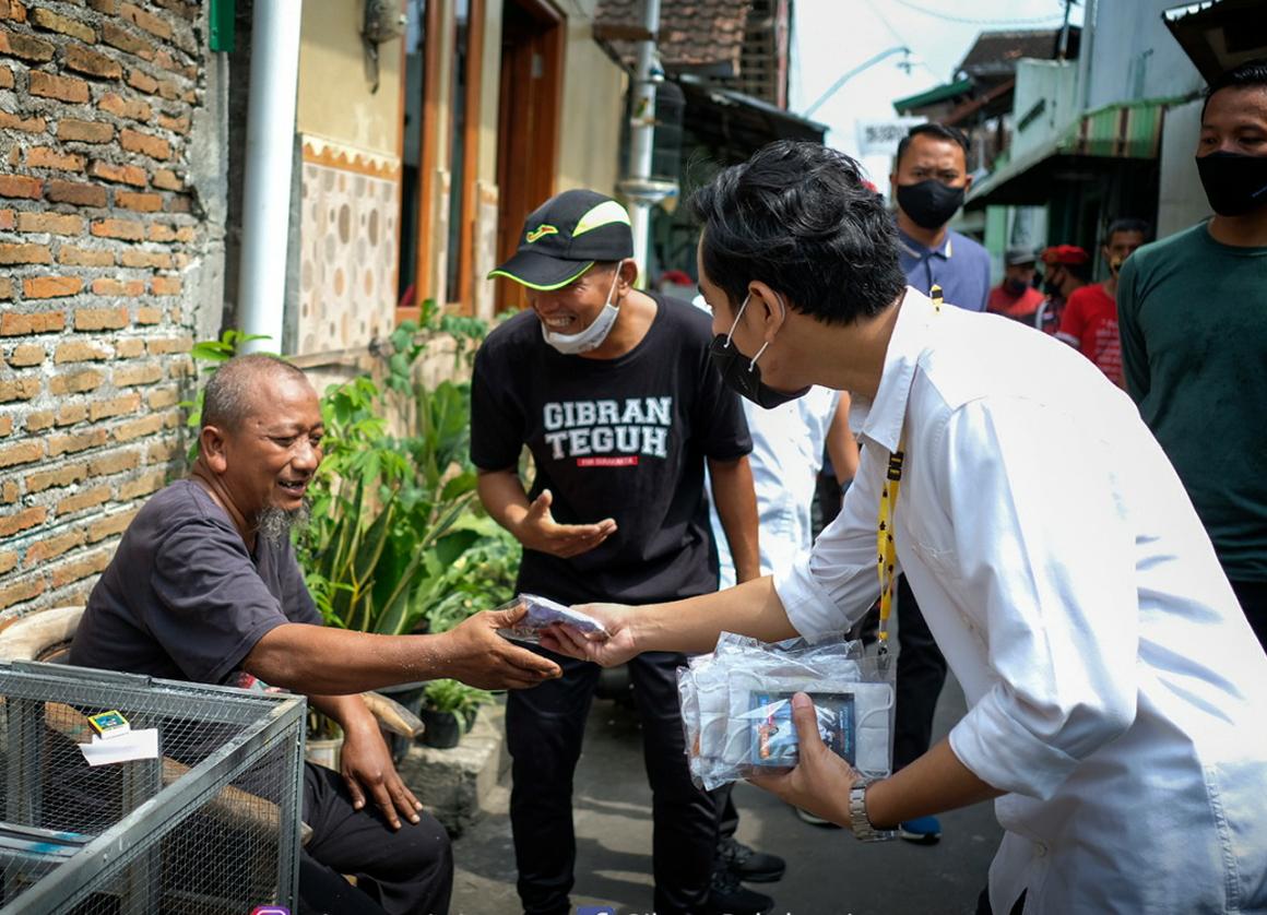 Usai sarasehan singkat, Gibran pun berkeliling kampung mendampingi petugas penyemprotan disinfektan. Dari rumah ke rumah dia turut membagikan masker, “Sehat, Bapak-Ibu? Ini ada masker, silakan dipergunakan, pokoknya kalau aktivitas jangan lupa protokol kesehatan, nggih,” tutur pria yang sudah memulai bisnis sejak usia 23 tahun itu.