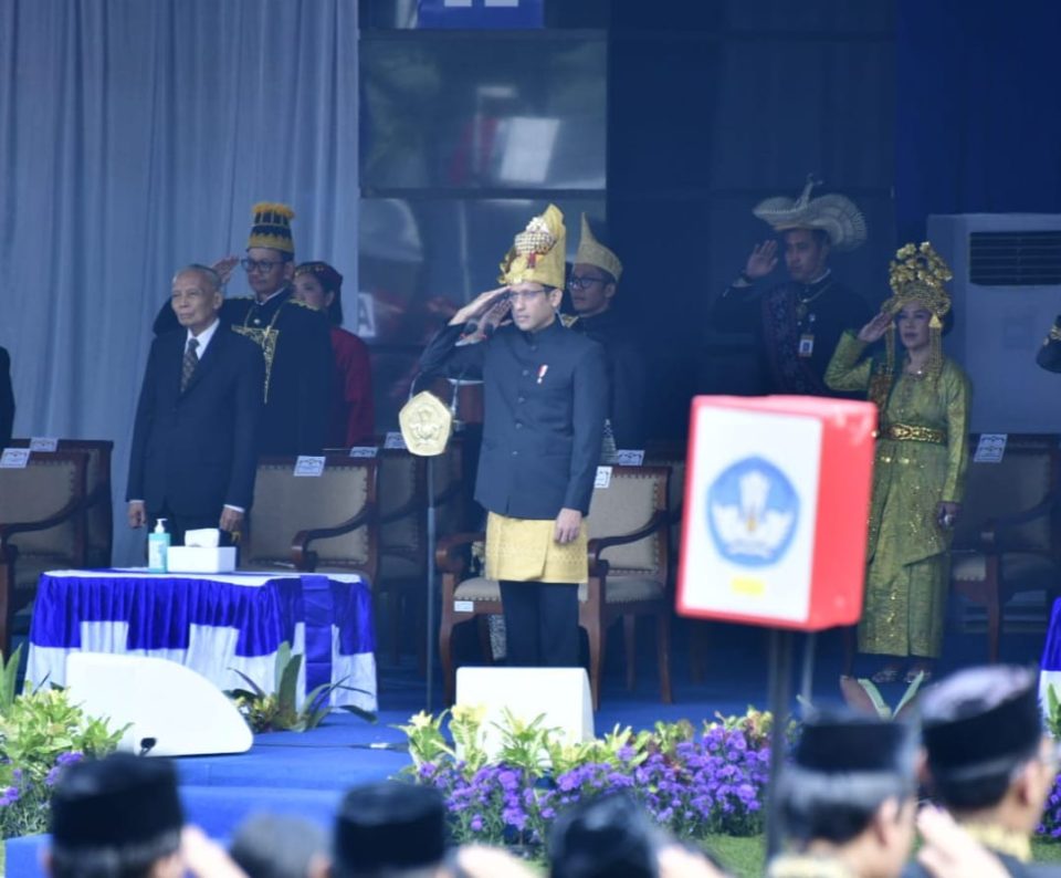JAKARTA (Suara Karya): Menggunakan baju adat Aceh, Linto Baro, Menteri Pendidikan, Kebudayaan, Riset, dan Teknologi (Mendikbudristek) Nadiem Anwar Makarim memimpin upacara peringatan Hari Pendidikan Nasional (Hardiknas) 2023 di halaman kantor Kemdikbudristek, Jakarta, Selasa (2/5/23).