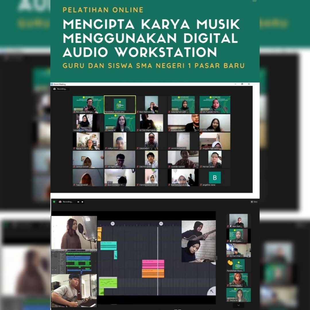 Pelatihan Mencipta Karya Musik Menggunakan Digital Audio Workstation Bagi Guru dan Siswa SMA Negeri 1 Pasar Baru katanya, diberikan melalui sistem daring zoom meeting dari rumah masing – masing. Pertemuan pertama dilaksanakan pada hari Senin 17 Juni 2021 pukul 10.00-12.00.
