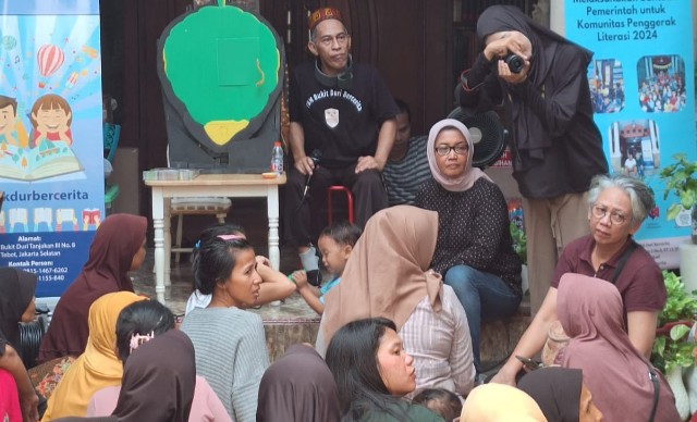 JAKARTA (Suara Karya): Pendongeng yang kerap menggunakan alat peraga dari berbagai barang yang ada di sekitar rumah, PM.Toh memperlihatkan kepiawaiannya dalam berkisah di Taman Bacaan Masyarakat (TBM) Bukit Duri Bercerita, Minggu pagi-siang (13/10/2024). PM Toh yang bernama asli Agus Nuramal dengan gaya khasnya bercerita, bukan saja menghibur tapi memberi inspirasi mudahnya mendongeng dengan bantuan benda-benda yang ada di sekitar rumah.