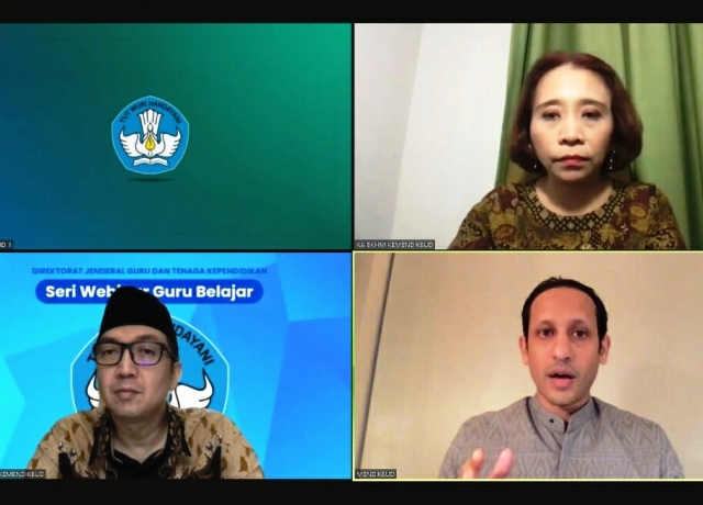 Nadiem saat itu didampingi Dirjen Guru dan Tenaga Kependidikan (GTK) Kemdikbud, Iwan Syahril dan Kepala Biro Kerja Sama dan Hubungan Masyarakat (BKHM) Kemdikbud, Evy Mulyani.