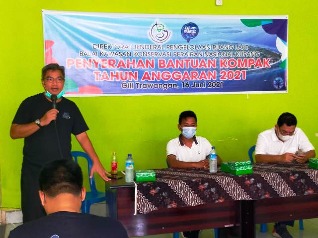 Bantuan KOMPAK diserahkan langsung kepada Kelompok Masyarakat Pengawas Kelautan dan Perikanan (POKMASWAS) Gili Matra oleh Direktur Konservasi dan Keanekaragaman Hayati Laut (KKHL) Andi Rusandi yang didampingi Kepala BKKPN Kupang Imam Fauzi. Penyerahan tersebut dilakukan di Balai Dusun Gili Trawangan, Desa Gili Indah, Kecamatan Pemenang, Kabupaten Lombok Utara, Provinsi Nusa Tenggara Barat pada (16/6/2021) lalu.
