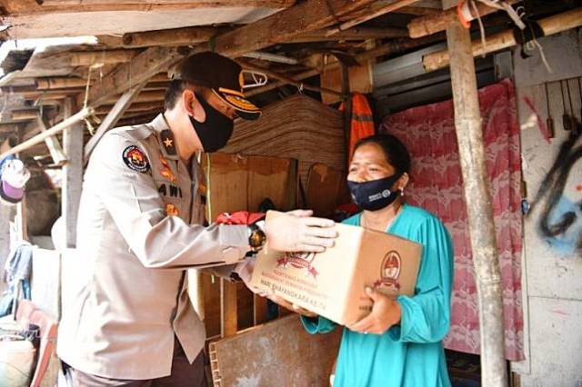 Penyerahan bantuan dilakukan secara simbolis oleh Kepala Biro Penerangan Masyarakat Divisi Humas Polri Brigjen Pol Awi Setiyono kepada warga di sekitar wilayah Musholla Khairul Ummah Al Barokah, Bantar Gebang, Bekasi.