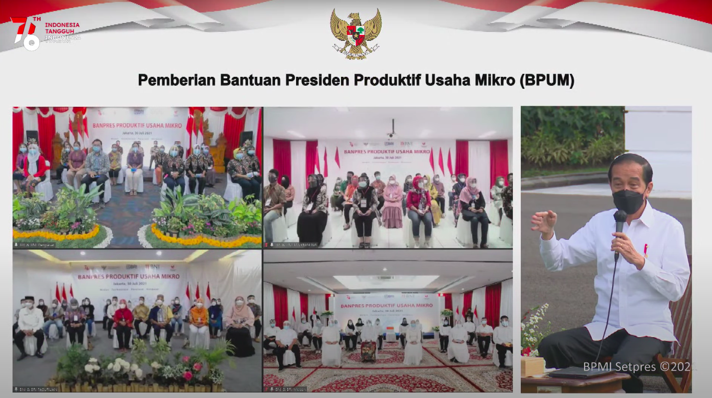 JAKARTA (Suara Karya): Presiden RI Joko Widodo (Jokowi) menyerahkan Bantuan Presiden Produktif Usaha Mikro (BPUM) Tahun 2021 secara simbolis kepada 20 perwakilan penerima bantuan, di Halaman Depan Istana Merdeka, Jakarta, Jumat (30/7/2021) pagi. Acara ini turut dihadiri oleh penerima BPUM lainnya secara daring.