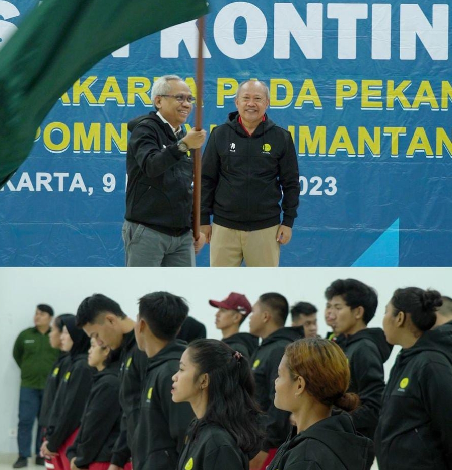 “Dukungan sebesar 40 persen mahasiswa UNJ di tubuh kontingen DKI Jakarta, diharapkan berperanan dalam mempertahankan juara umum di Kalsel nantinya, ” tegas Prof. Dr. Komarudin, M.Si saat melepas mahasiswa UNJ di GOR UNJ, Kamis (9/11/2023).