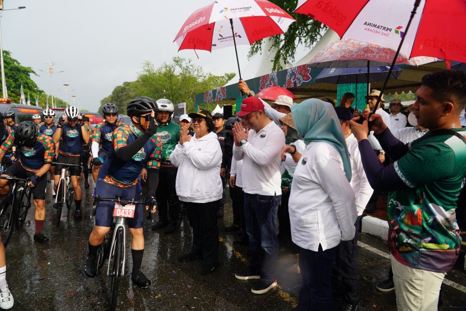 Selain Menteri LHK, Siti Nurbaya, Kepala BRGM, Hartono Prawiraatmaja, Dirjen PPKL KLHK, Sigit Reliantoro, Kapolda Kaltim, Irjen Pol Imam Sugianto dan lainnya turut melepas peserta fun rice bike di tengah guyuran hujan di Lapangan Merdeka Balikpapan,