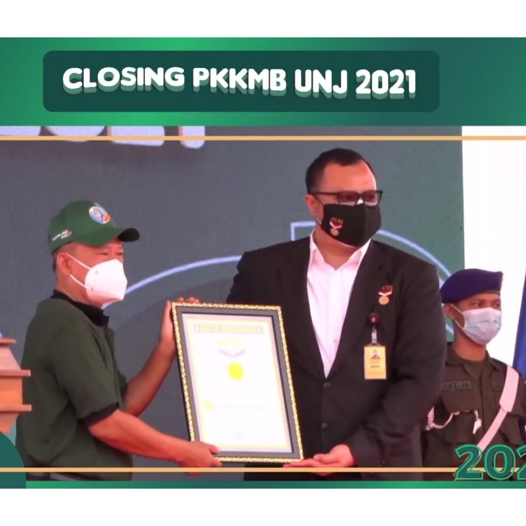 UNJ setelah mencatat rekor Senam SENSI (Sendok dan Kursi) secara virtual yang dilakukan 6.433 mahasiswa baru UNJ. PKKMB UNJ 2021 dilakukan secara luring di Lahan UNJ Cikarang seluas 80,2 Hektar, dan daring Zoom serta disaksikan seluruh sivitas akademika UNJ serta para mahasiswa baru (Sabtu, 21/08/2021).