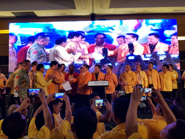 Ketua Dewan Pakar, Partai Golkar ini kemudian menyerahkan hasil Rekomendasi Manado kepada Airlangga Hartarto, yang disaksikan oleh hadirin di antaranya, Wakil Ketua Pembina Partai Golkar Theo Sambuaga, Menpora Zainudin Amali, Menteri Perindustrian Agus Gumiwang, Wakil Ketua DPR RI Azis Syamsudin, Wamen Perdagangan Jerry Sambuaga, serta ratusan Ketua DPD I dan II Golkar se-Indonesia Timur. (Indra DH)